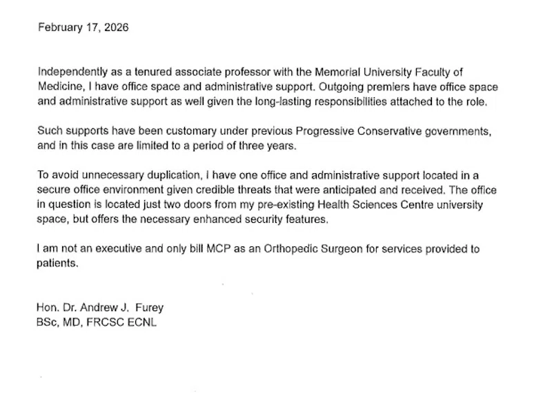 In a statement to VOCM News, Andrew Furey says that as a tenured associate professor with MUN’s Faculty of Medicine, he has office space and administrative support, and outgoing premiers are granted similar systems due to the “long-lasting responsibilities attached to the role.”